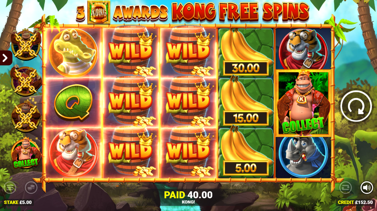 The technical base of King Kong Cash is transparent and convenient for daily play. The configuration is 5 reels × 3 rows and 20 fixed paylines, which eliminates unnecessary settings and speeds up the start. The RTP of around 95.79% sets a familiar balance for entertainment slots, and frequent small wins are followed by periodic bursts thanks to bonuses. The betting range is £0.20–£100, so the slot is comfortable for both careful bankrolls and bold express sessions. The theme is a cartoon jungle with the king of the scene, King Kong, who occasionally intervenes in the game. In terms of gameplay, it is important to remember that combinations are counted from left to right, with a minimum of three symbols on a line. In the ‘normal’ game, Wild (golden crown) and Scatter (barrels) help, Wild completes chains, and three or more Scatters trigger the bonus wheel. Convenient features include autospins (up to 100), win/loss limits, and a turbo mode to speed up animations. Visually, the slot is easy on the eyes, with smooth transitions, readable icons, and competent sounds. All in all, this creates a rhythm of short games, where a couple of minutes can be turned into an intense mini-session, whether it’s a demo or real bets.